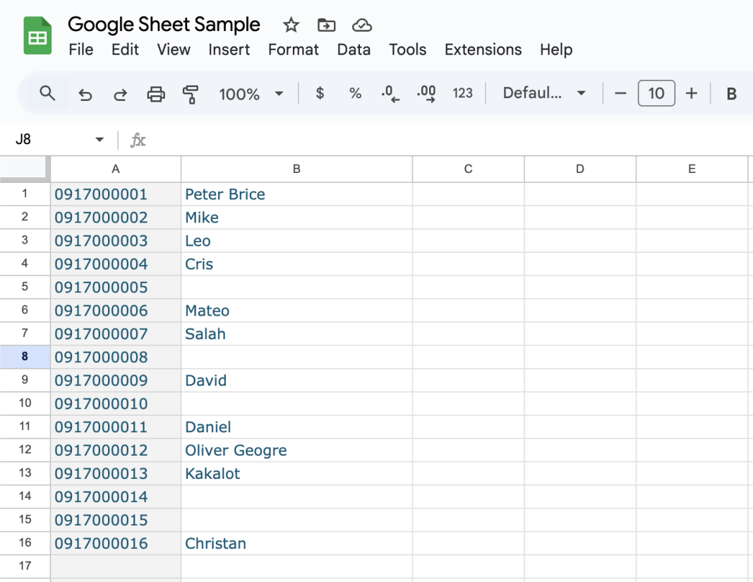 First, you need to open Excel or Google Sheets. Create a table where the first column contains the phone numbers (required), and the second column contains the names (optional). Then, save the file in .csv format.